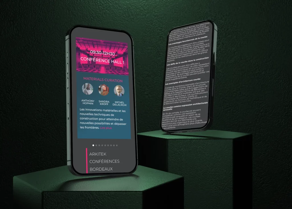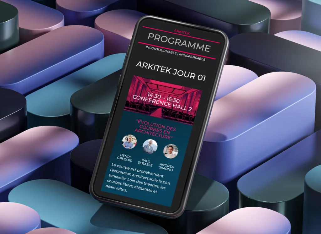 Arkitek a été pensé comme une plateforme digitale événementielle, permettant de présenter un programme riche autour de conférences, expositions et ateliers dédiés à l’architecture et au design urbain. L’objectif : offrir aux visiteurs une expérience immersive et pratique, en donnant accès à un planning clair et interactif tout en valorisant l’univers graphique inspiré de l’architecture contemporaine.